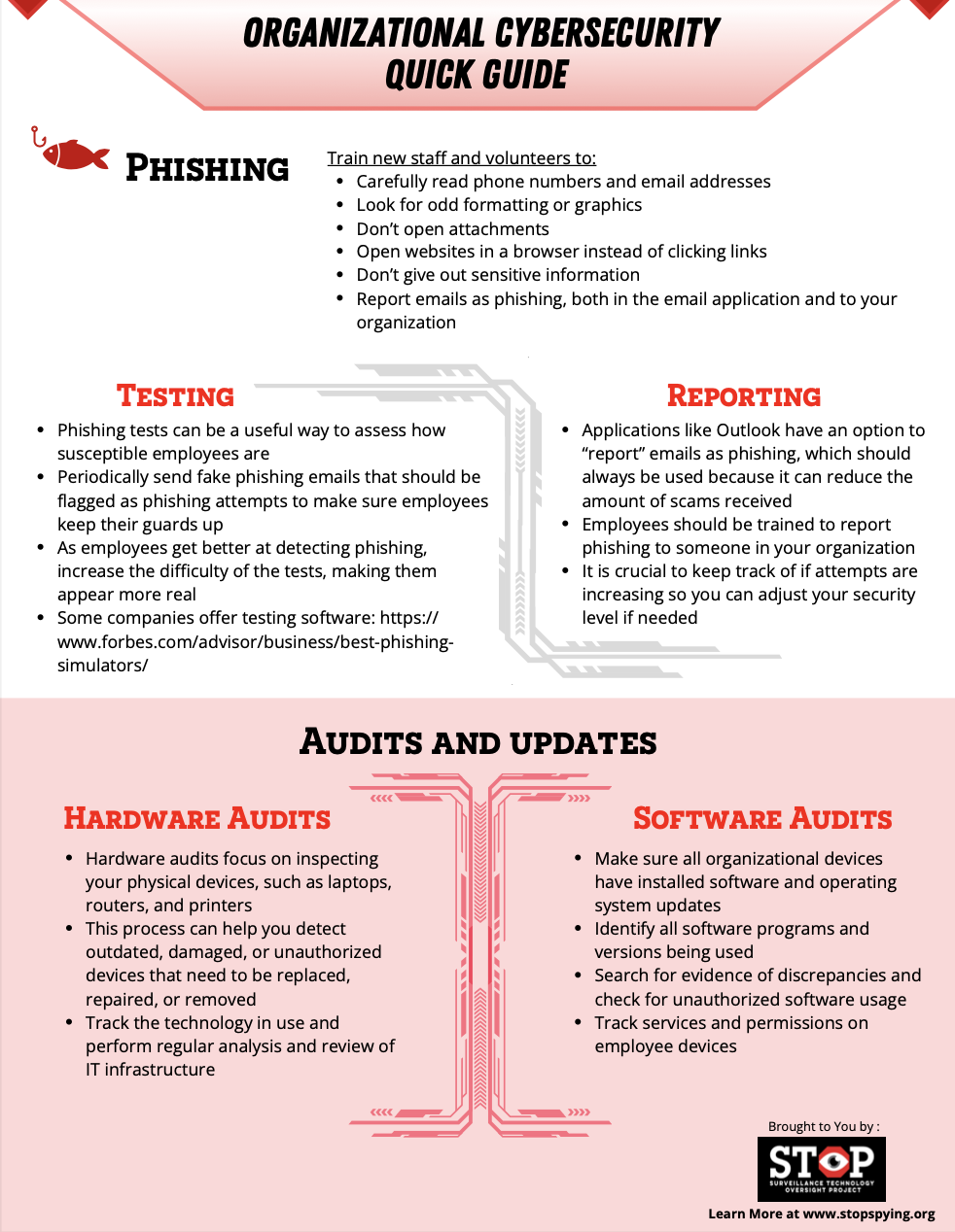S.T.O.P. created the Organizational Cybersecurity Quick Guide to help organizations strengthen their digital security from the inside out. The guide breaks down essential practices like hardware and software audits, phishing prevention, secure data storage, encryption, and safer onboarding and offboarding processes. It highlights how everyday employee mistakes — often caused by lack of training — are one of the biggest drivers of data breaches, and offers concrete steps to reduce that risk. From using end-to-end encryption and avoiding shared passwords to choosing more secure cloud storage and encrypted messaging tools, the guide equips organizations with practical ways to protect sensitive data and build a lasting culture of security.